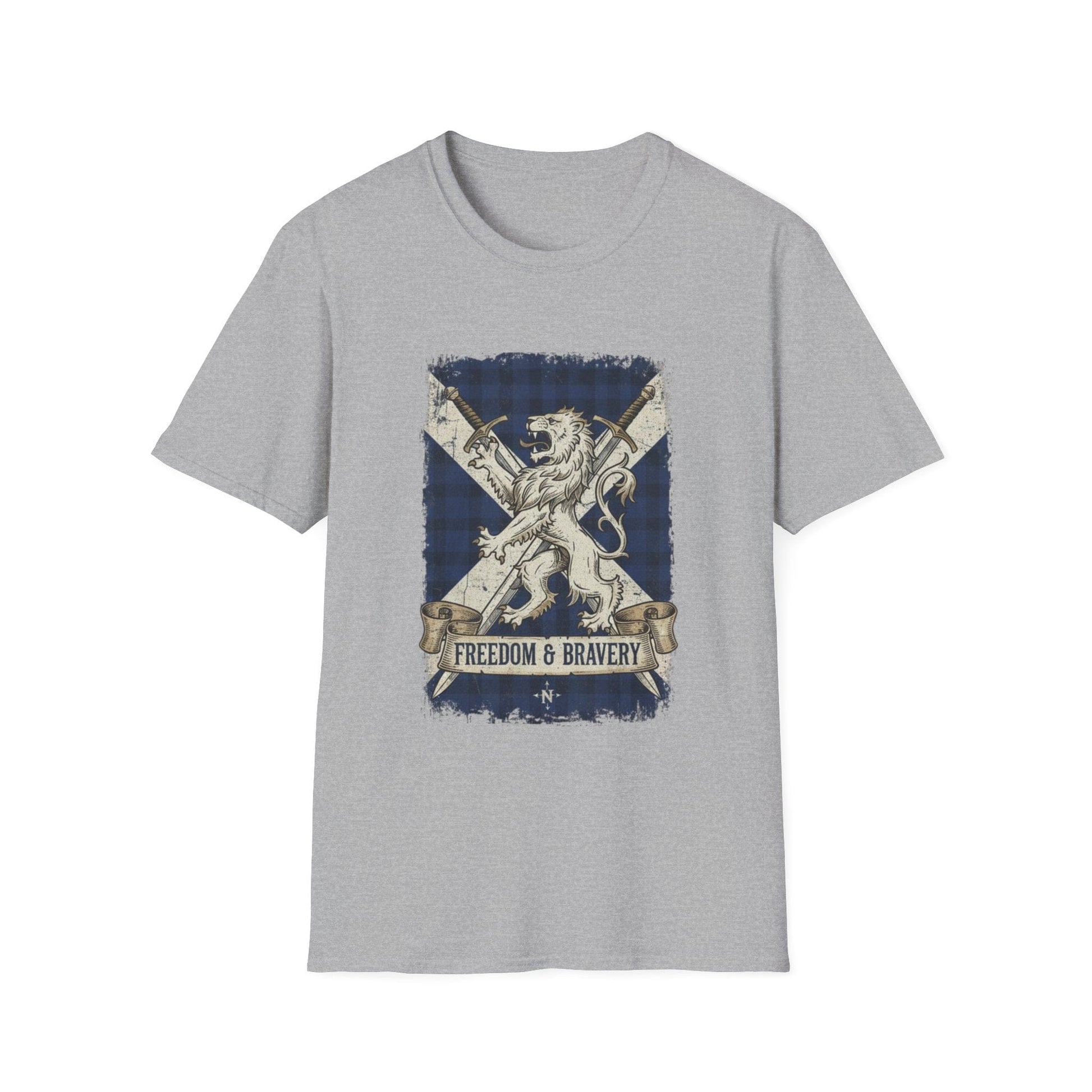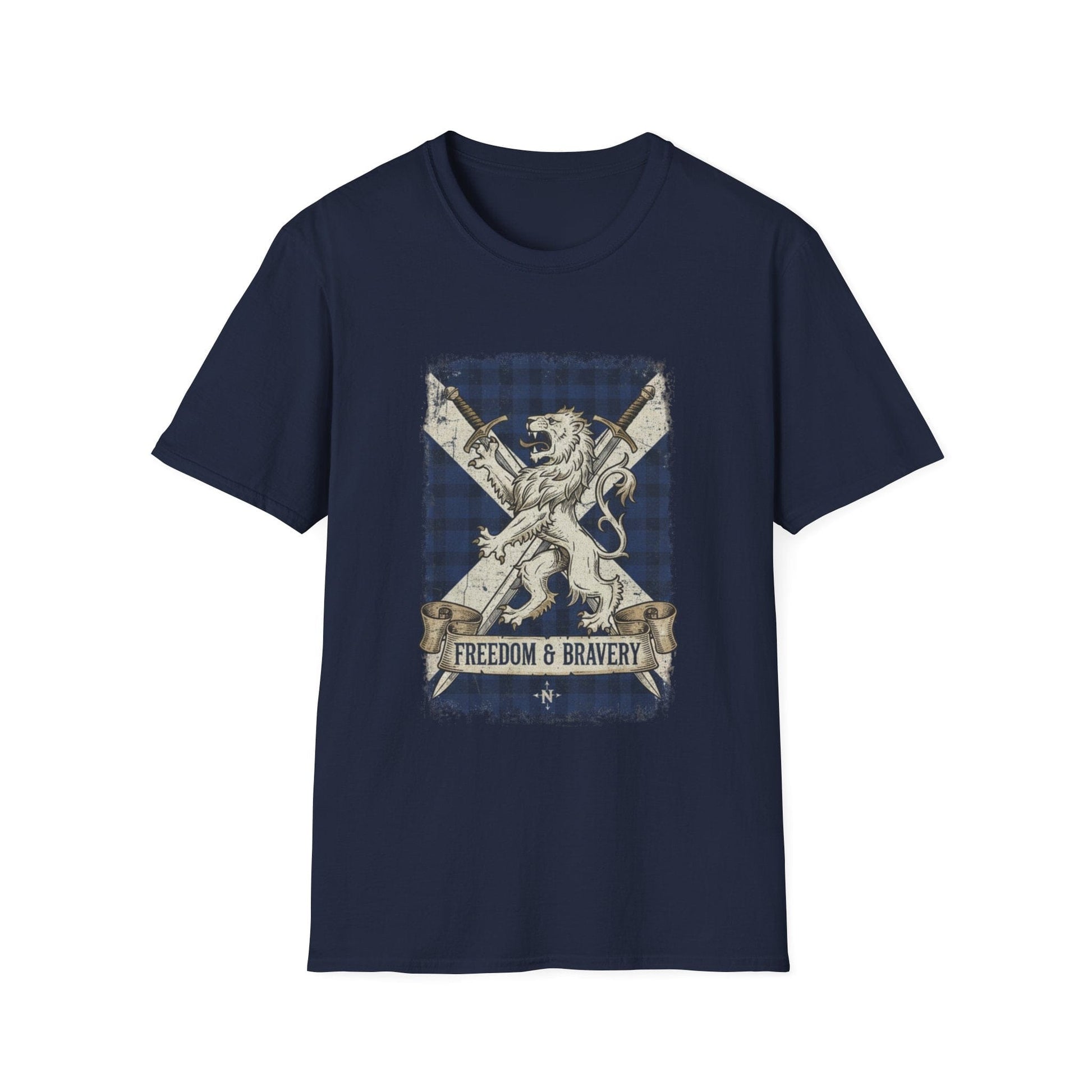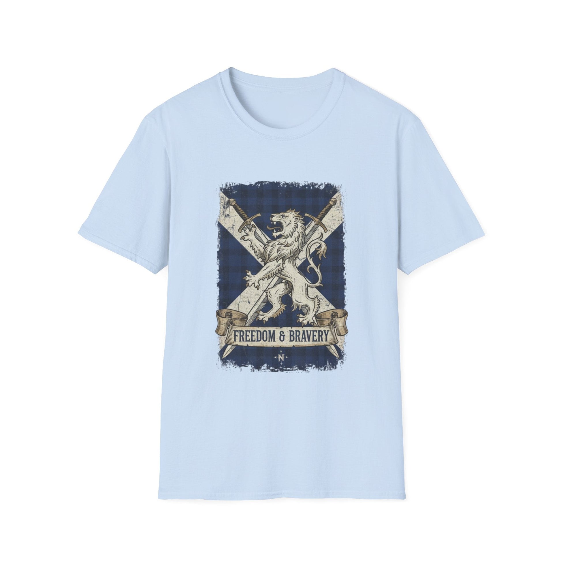 Show off your Scottish pride with this striking "Freedom & Bravery" T-shirt. Featuring a bold graphic of a majestic lion rampant set against the iconic blue and white Saltire (the Scottish flag) with a subtle tartan pattern, this shirt is a powerful symbol of heritage and strength.