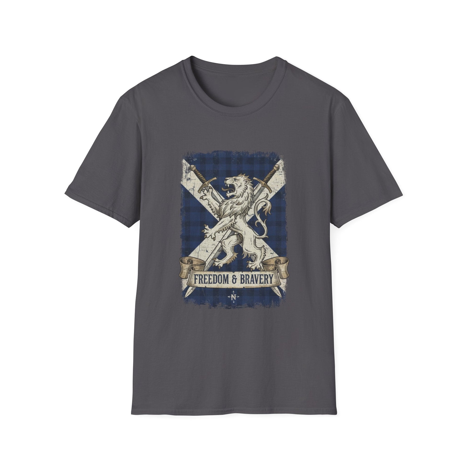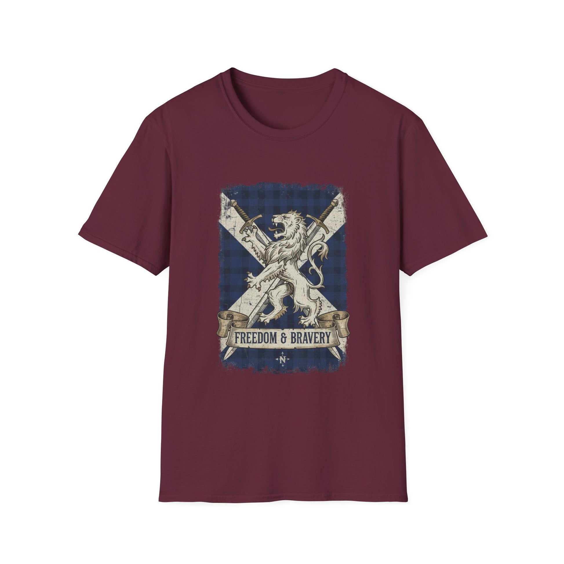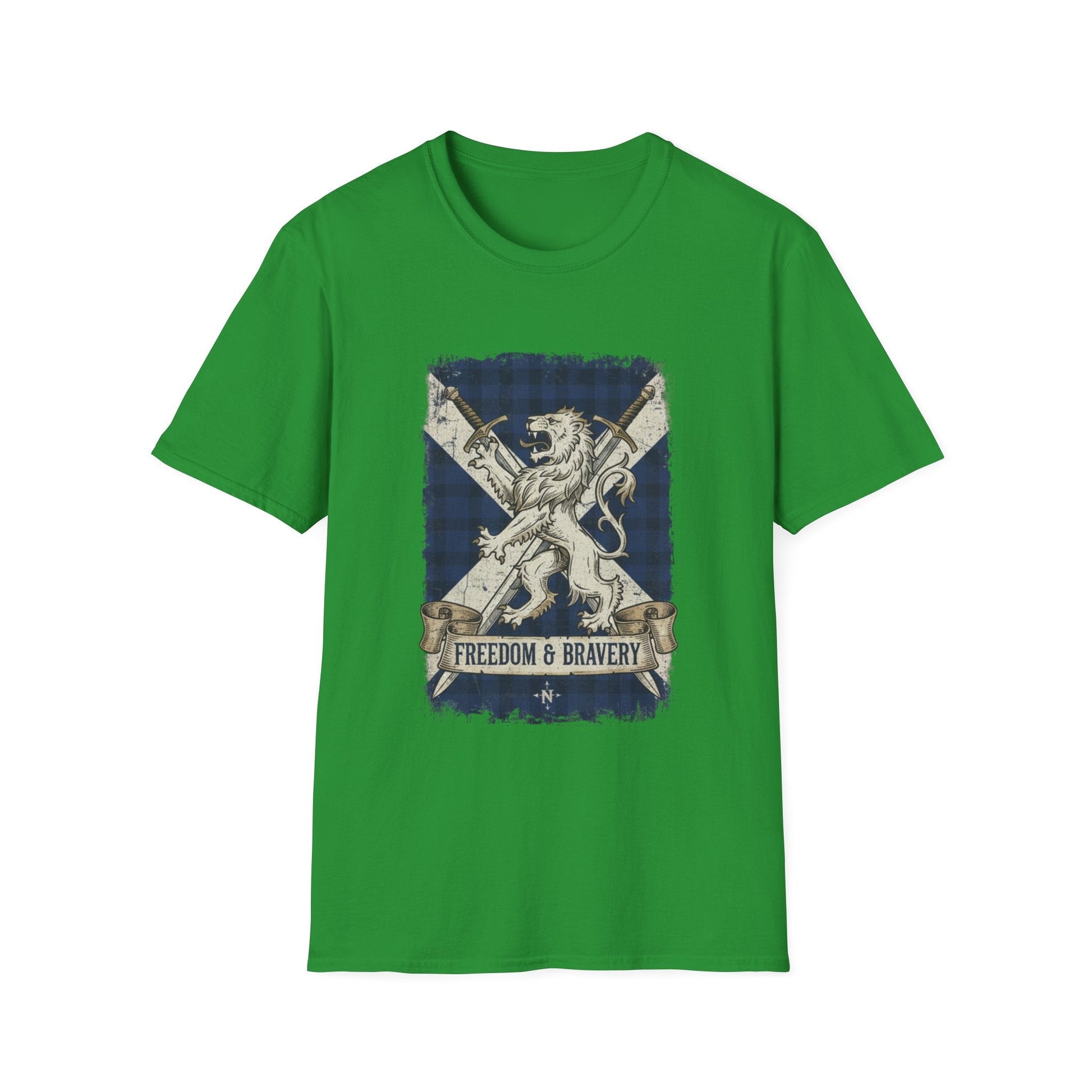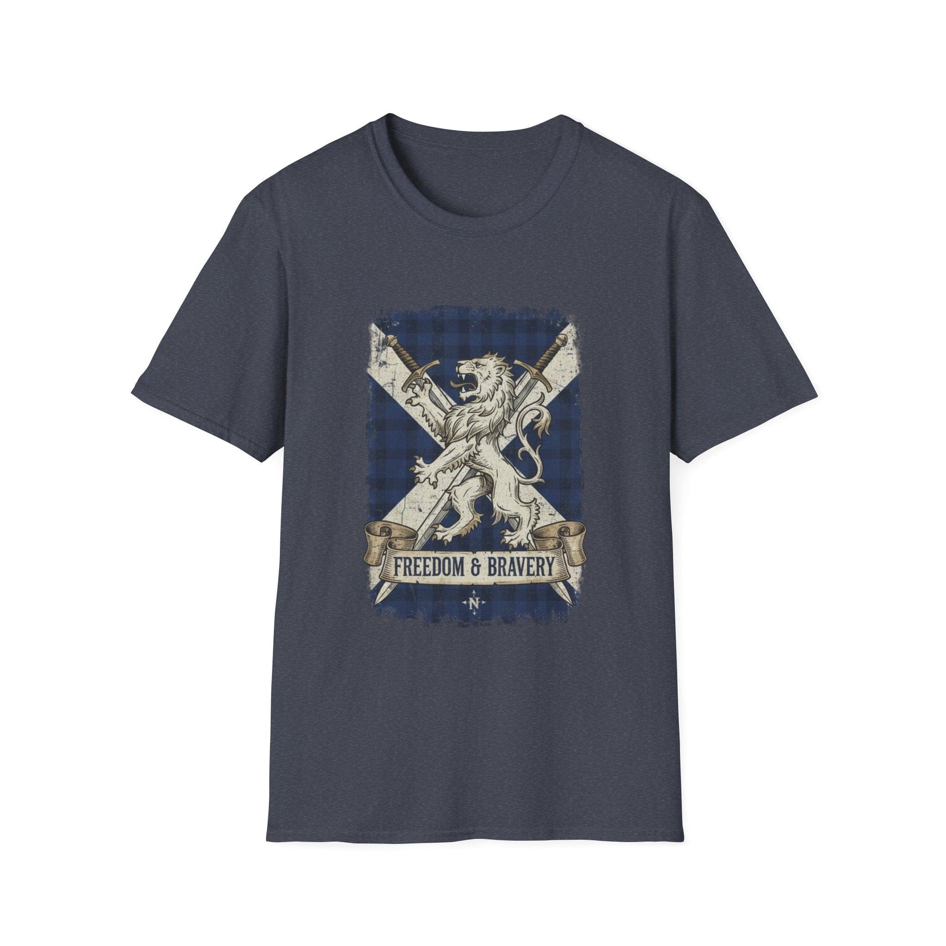 Show off your Scottish pride with this striking "Freedom & Bravery" T-shirt. Featuring a bold graphic of a majestic lion rampant set against the iconic blue and white Saltire (the Scottish flag) with a subtle tartan pattern, this shirt is a powerful symbol of heritage and strength.