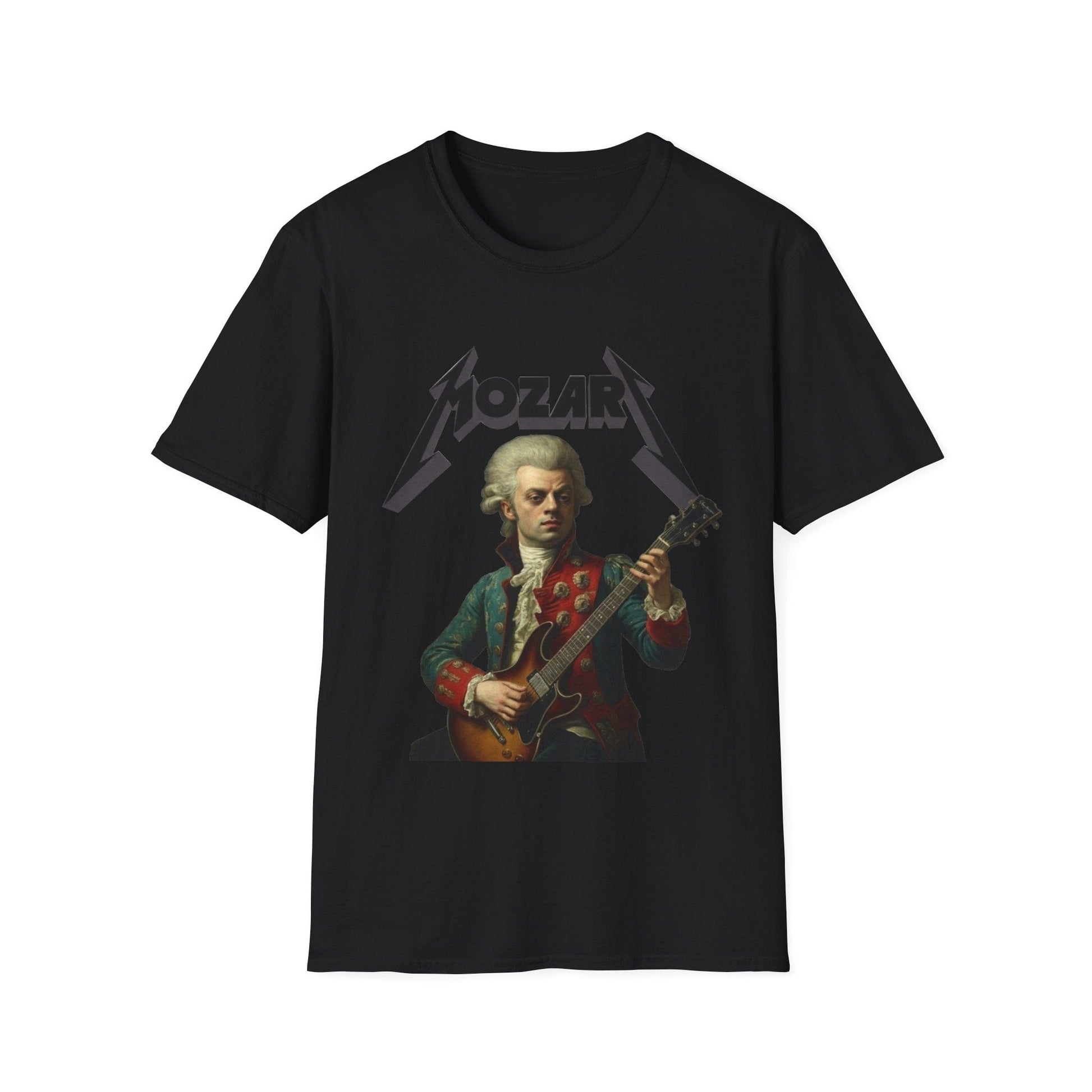 Forget the powdered wig and harpsichord; this tee reimagines Wolfgang Amadeus Mozart ready to shred. Featuring a classic portrait of the composer holding an electric guitar, crowned with his name in the legendary, sharp-edged lettering style of Metallica, this shirt is the ultimate tribute to music history—both classical and heavy.