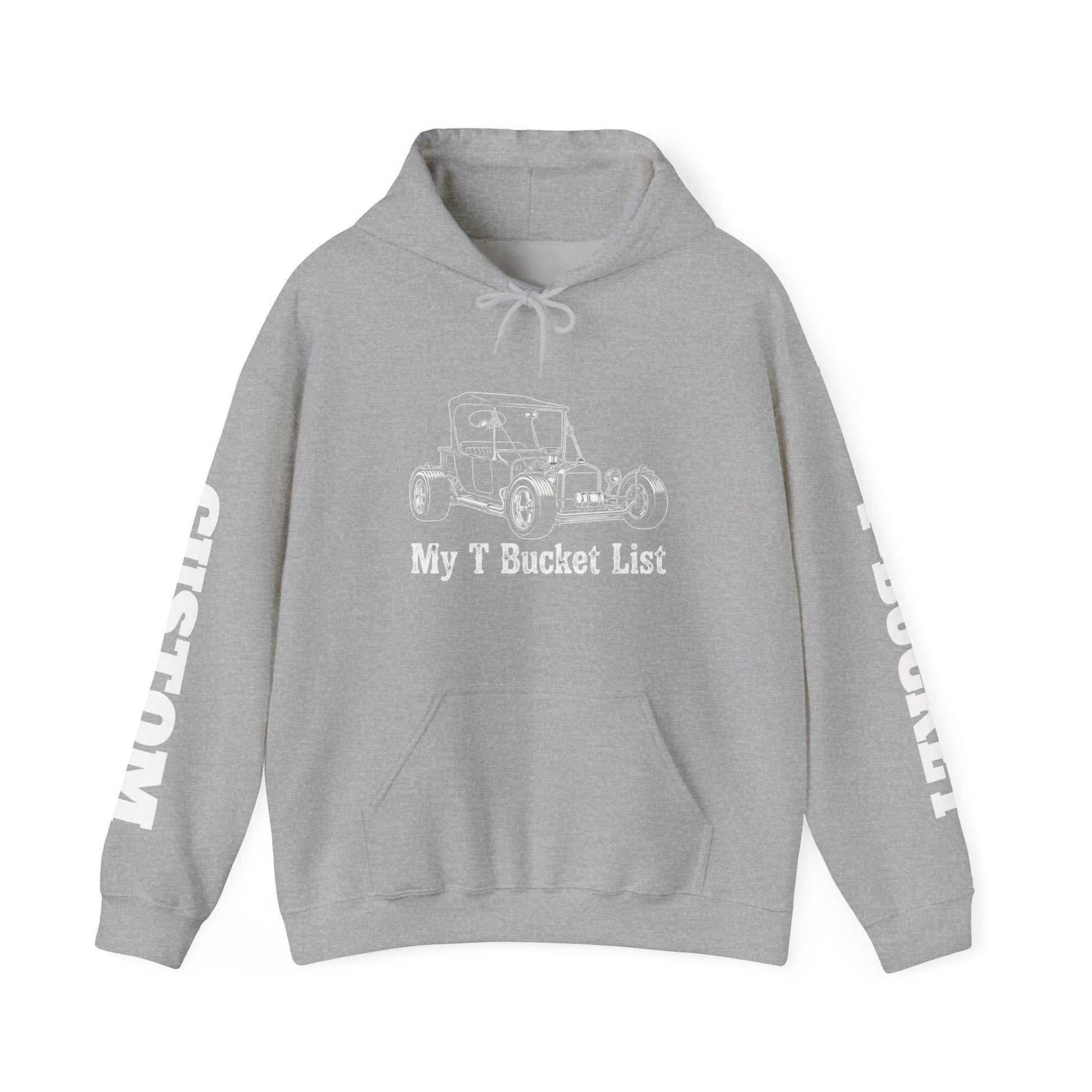 The "My T-Bucket List" Hoodie is the ultimate layer for hot rod builders and classic car enthusiasts. Featuring the detailed "T-Bucket List" schematic on the chest and bold, varsity-style lettering down the sleeves, this hoodie makes a statement from every angle.