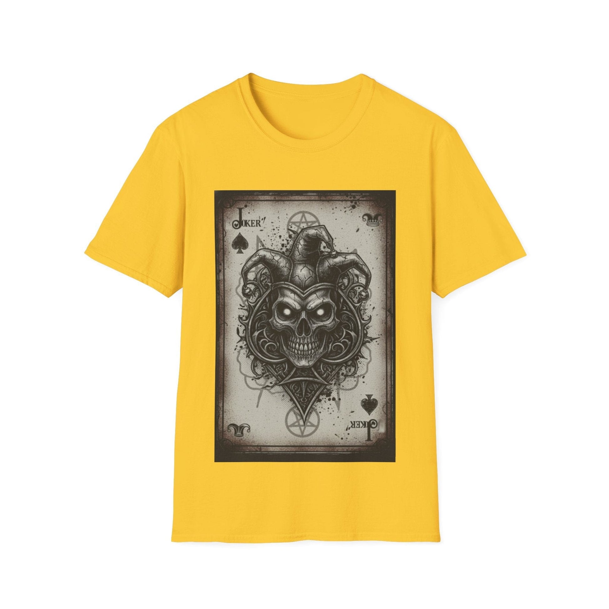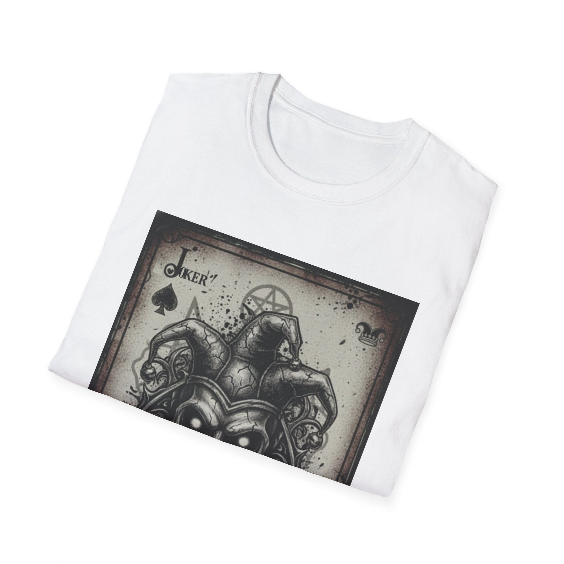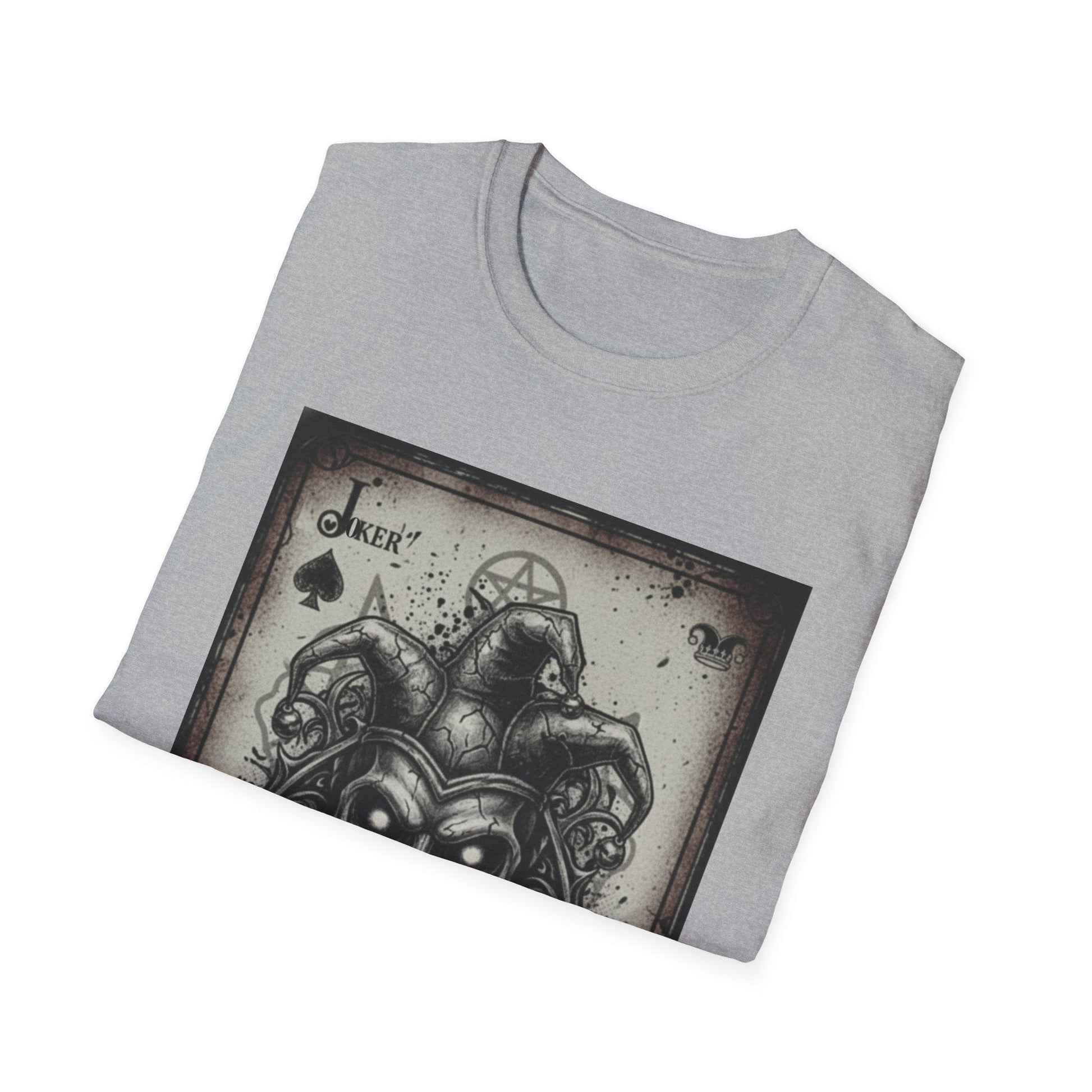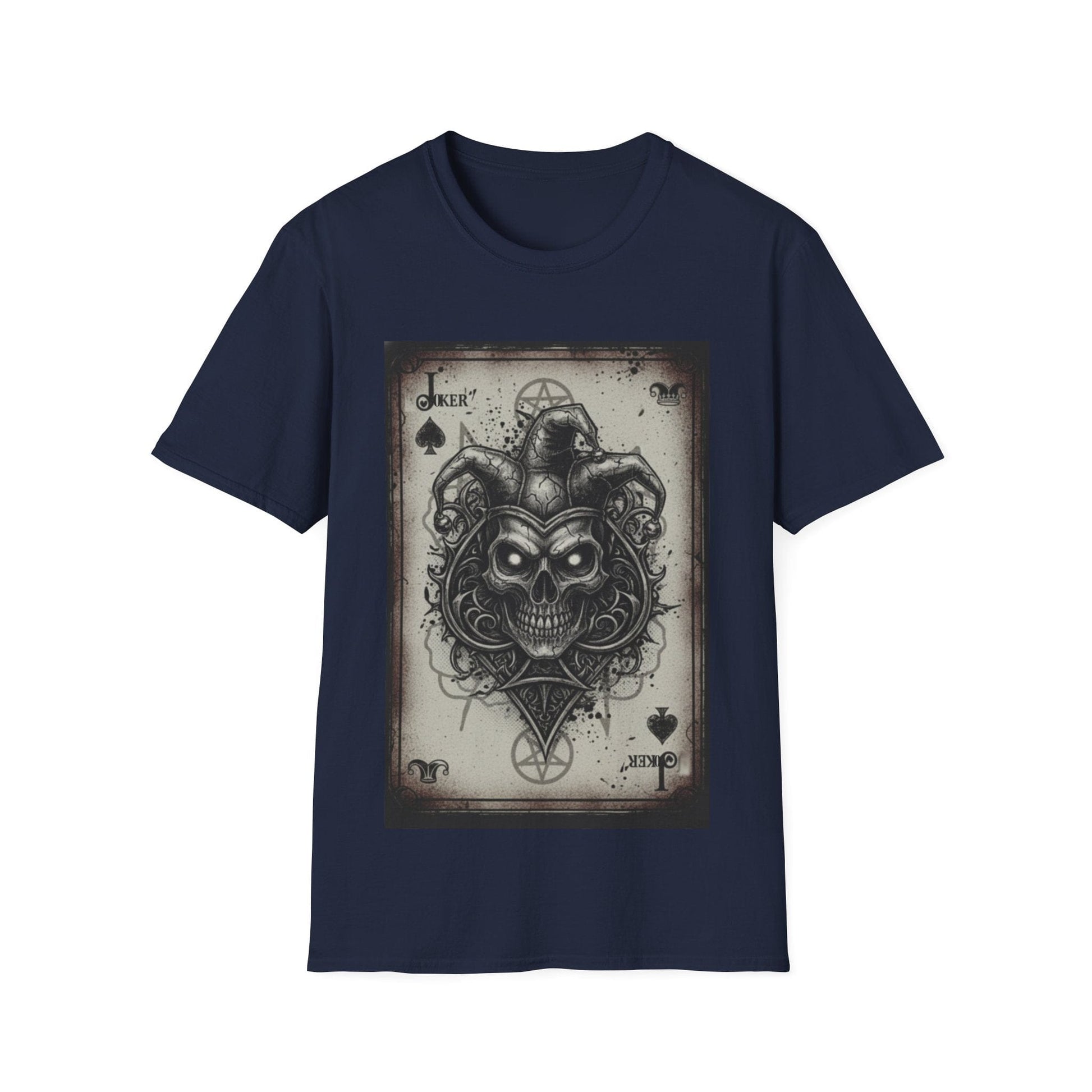 Designed for those who walk on the darker side of style, this shirt features a centerpiece illustration of a skeletal jester merged with a vintage-aged playing card. The intricate artwork blends gothic aesthetics with occult symbolism, including subtle pentagrams and ornate filigree, all set against a distressed parchment background.