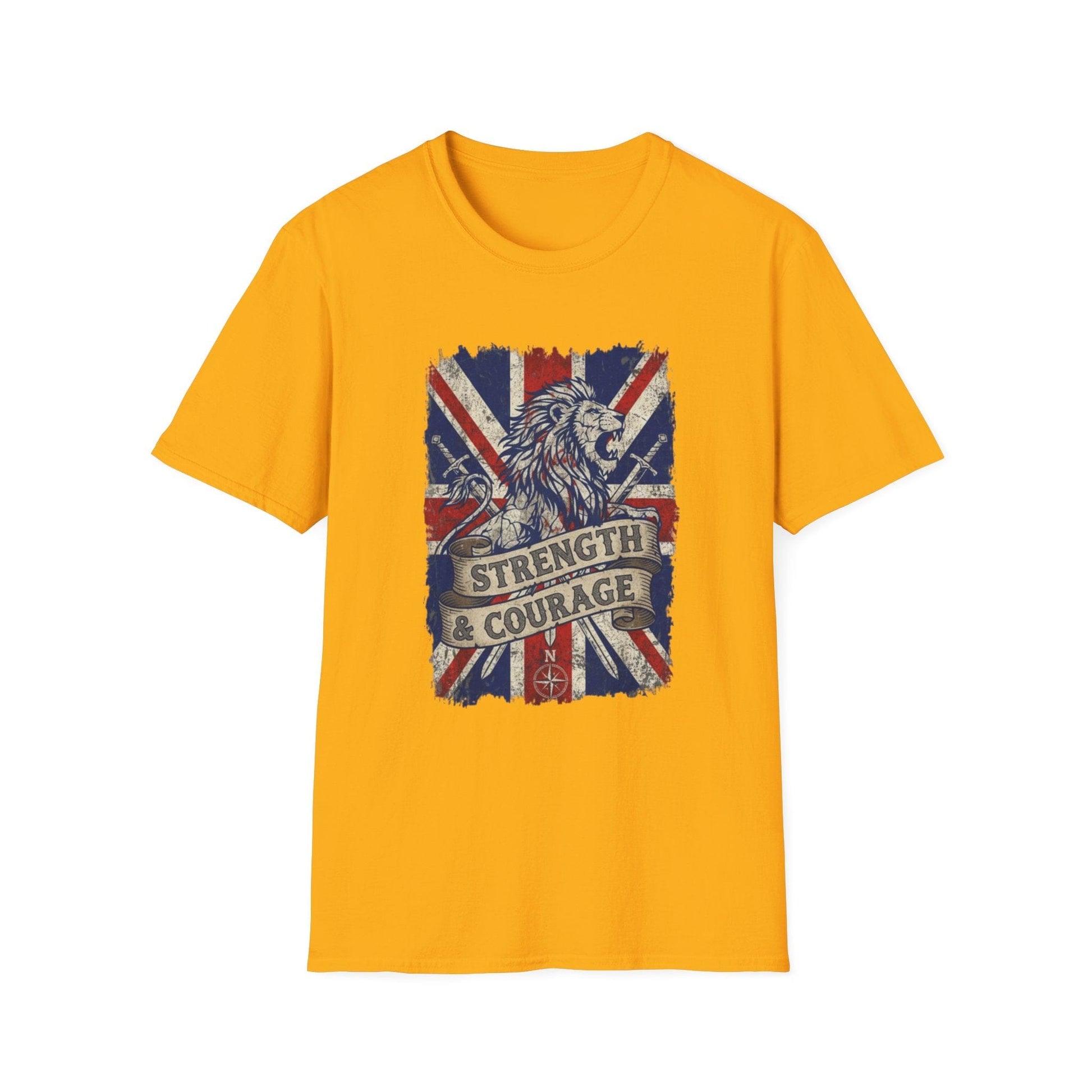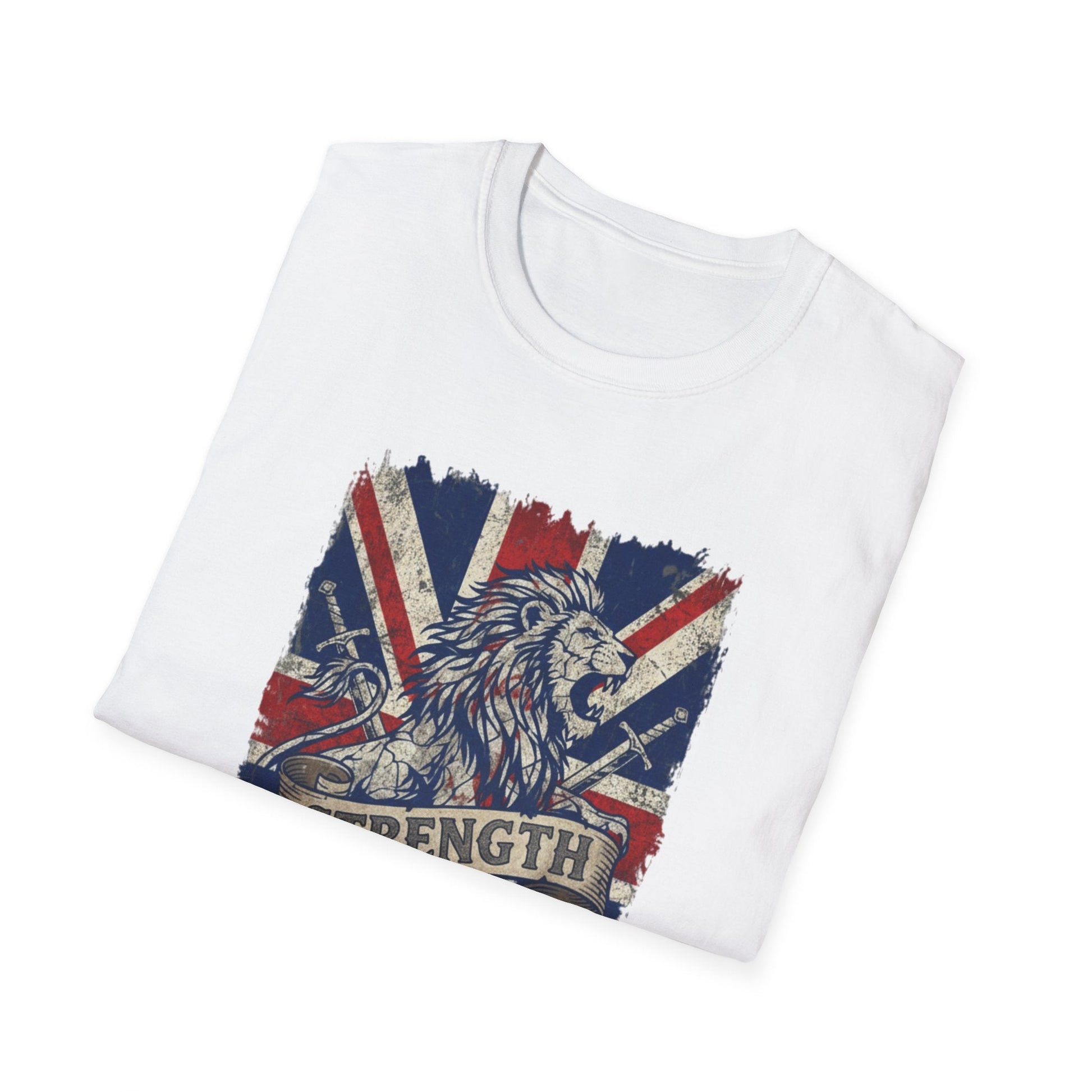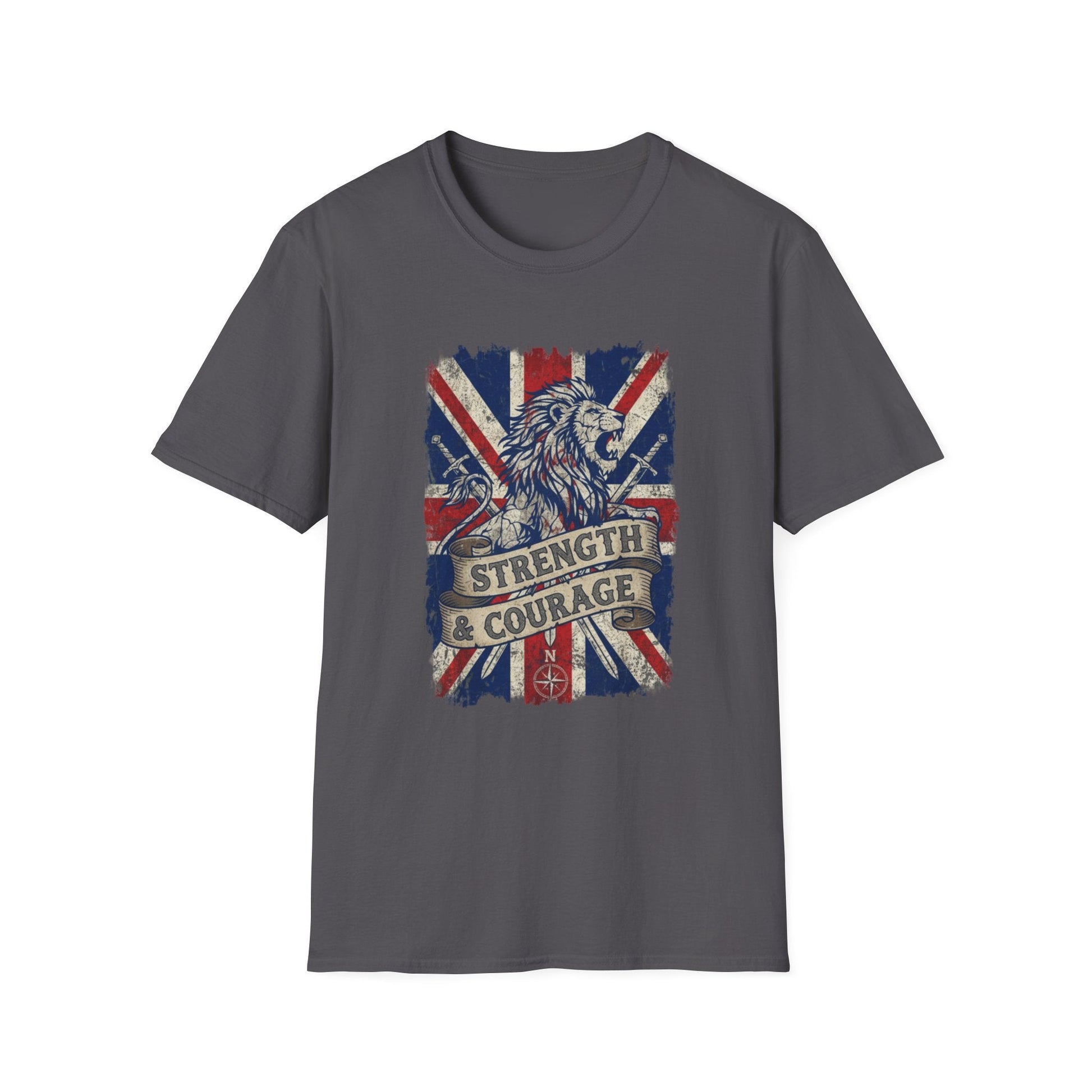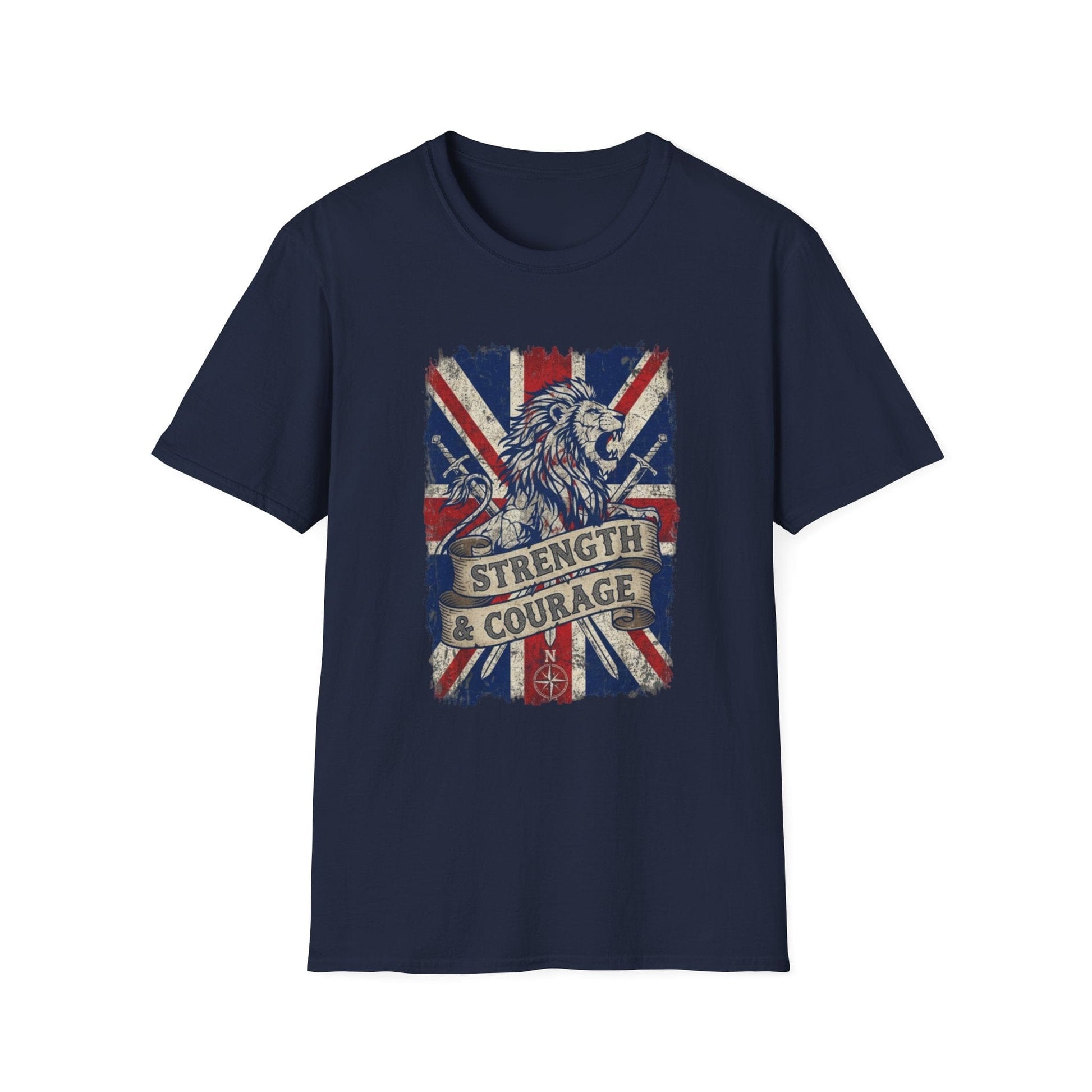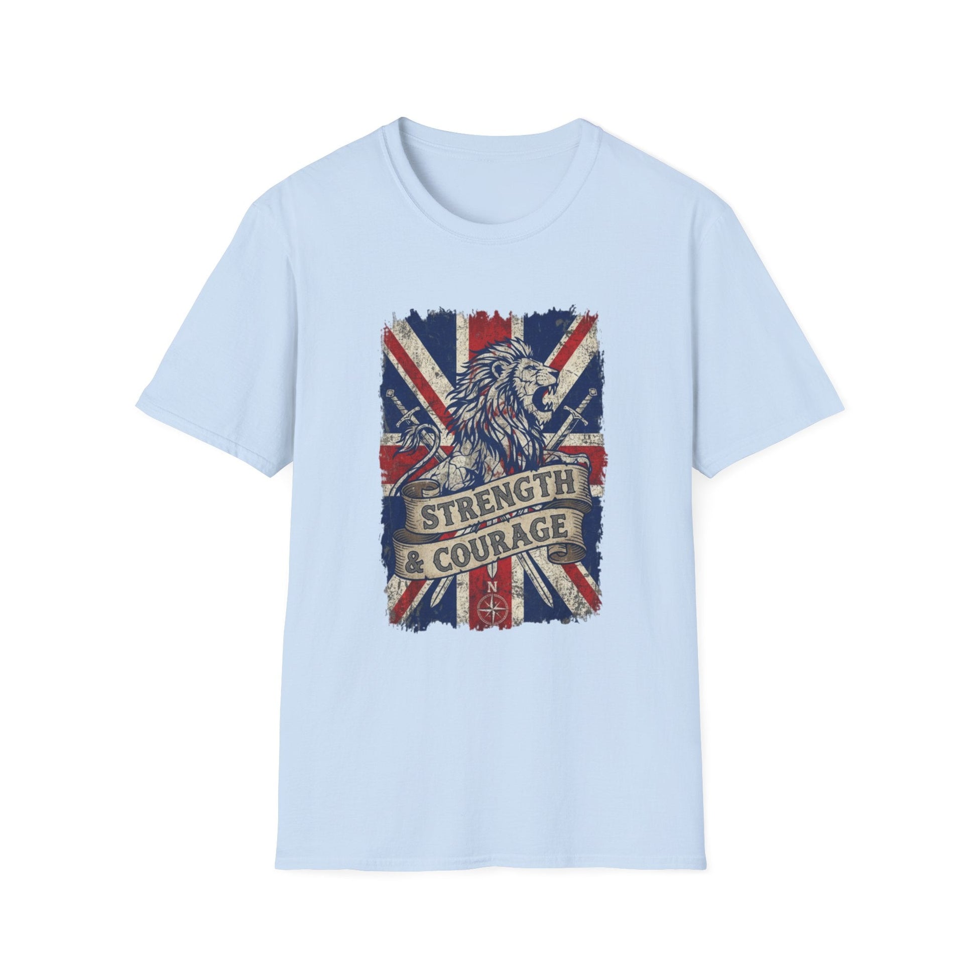 Embody the spirit of resilience with our "Strength & Courage" British Lion Tee. This high-quality graphic t-shirt features a powerful, roaring lion set against a weathered, vintage-style Union Jack flag. With crossed swords and a classic scroll banner, this design captures a timeless aesthetic of bravery and heritage.