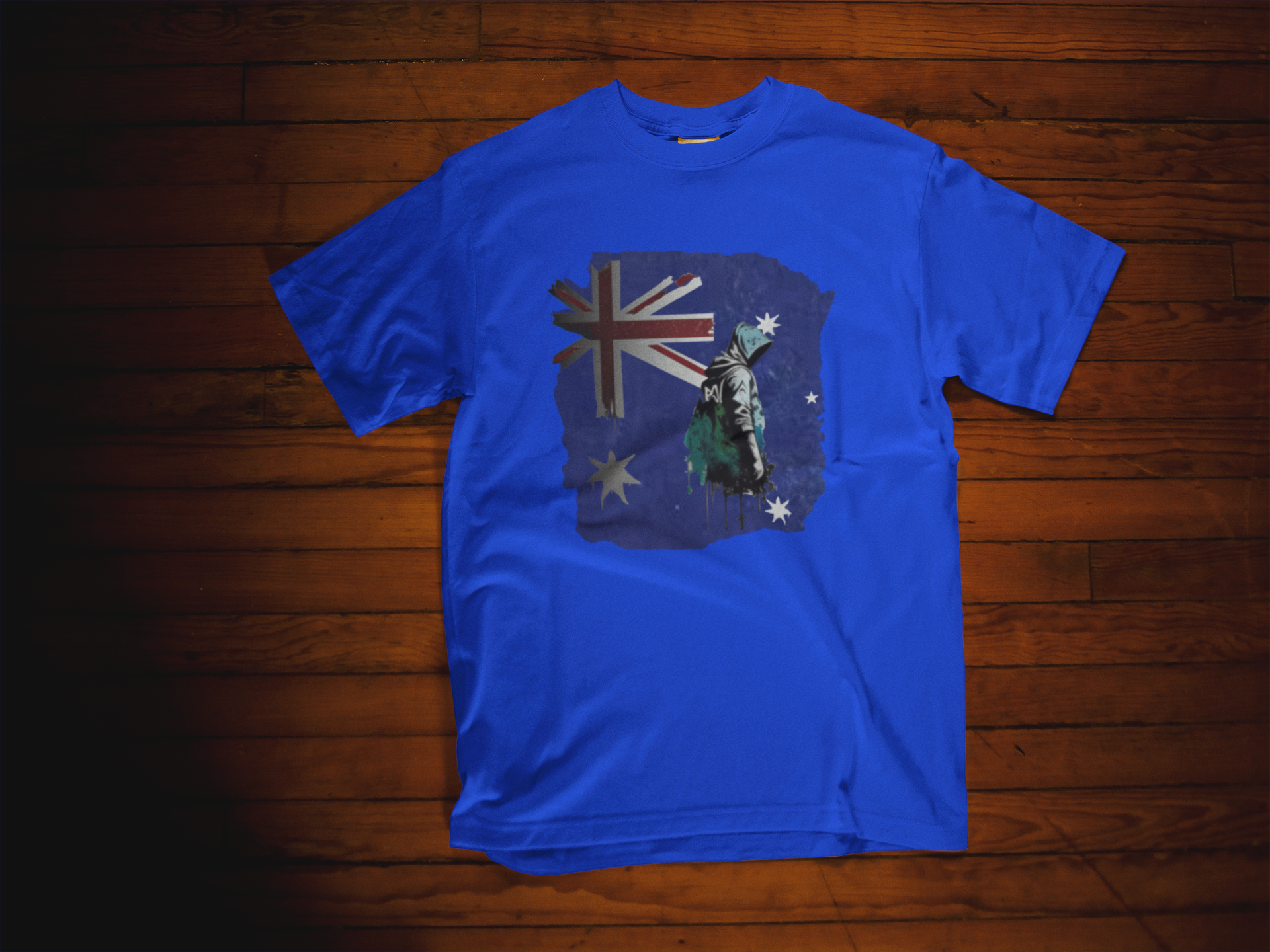 This unique graphic is a powerful blend of iconic street art aesthetics and national pride. The grungy, splattered paint and distressed finish give the design an authentic, rebellious edge, while the bold colors of the Australian flag demand attention.